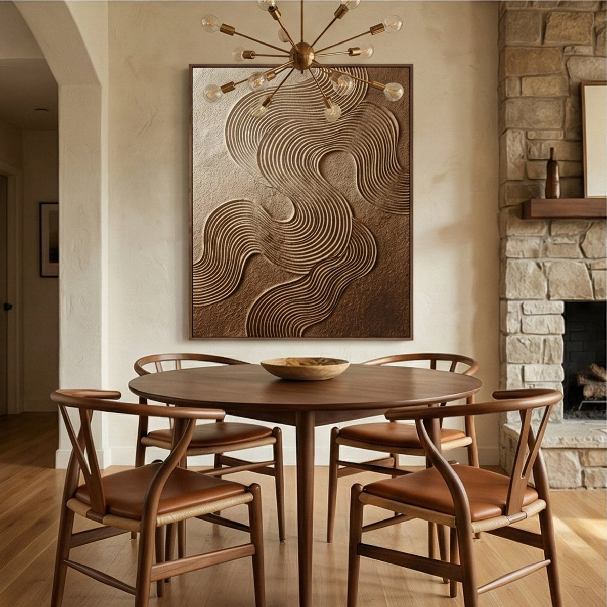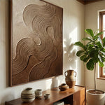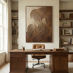 A framed abstract relief artwork features flowing, concentric wave patterns etched into a textured, golden-brown surface. The intricate lines create a sense of depth and movement, resembling topographic maps or wind-swept dunes, displayed against a neutral wall.