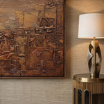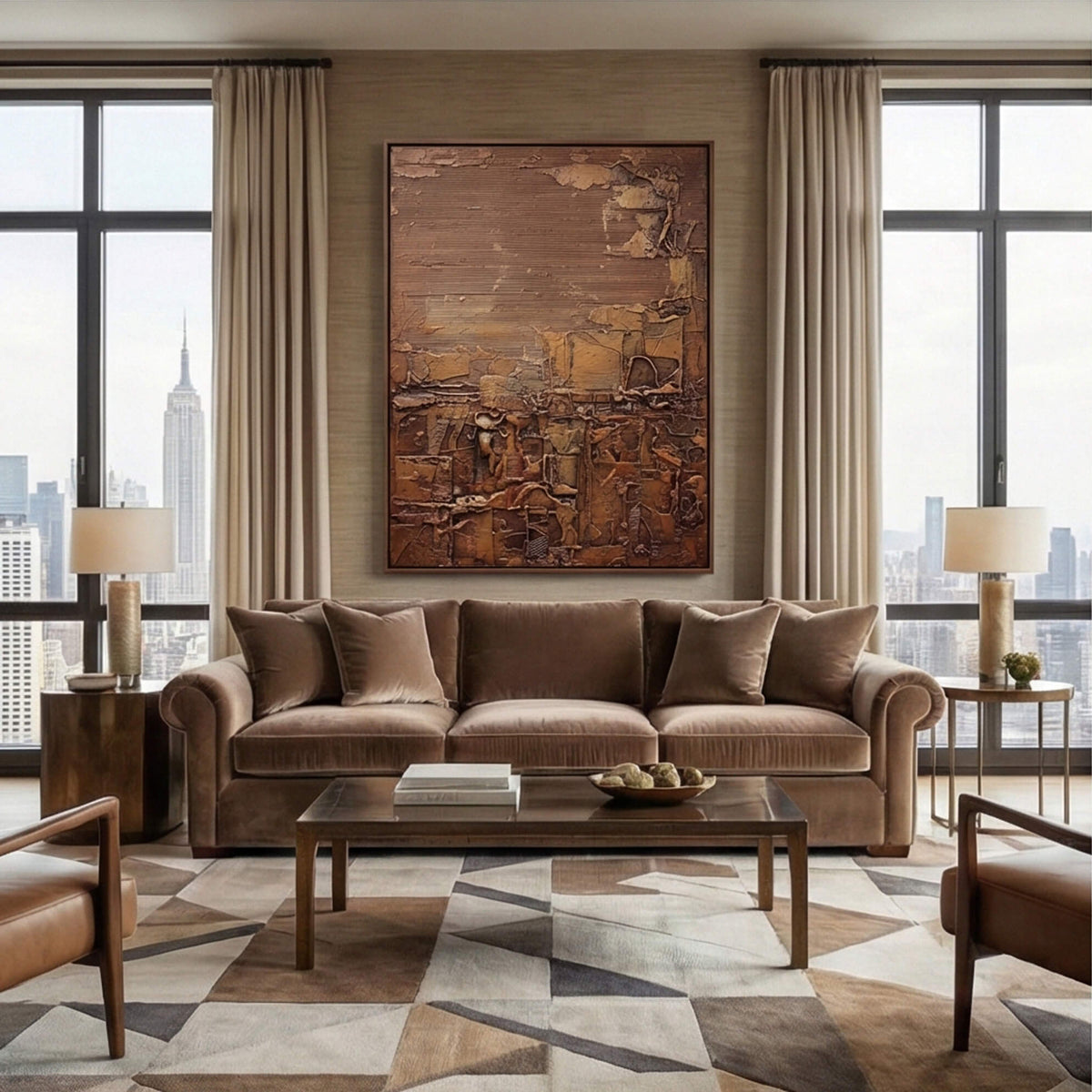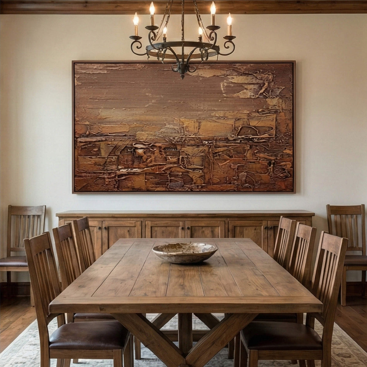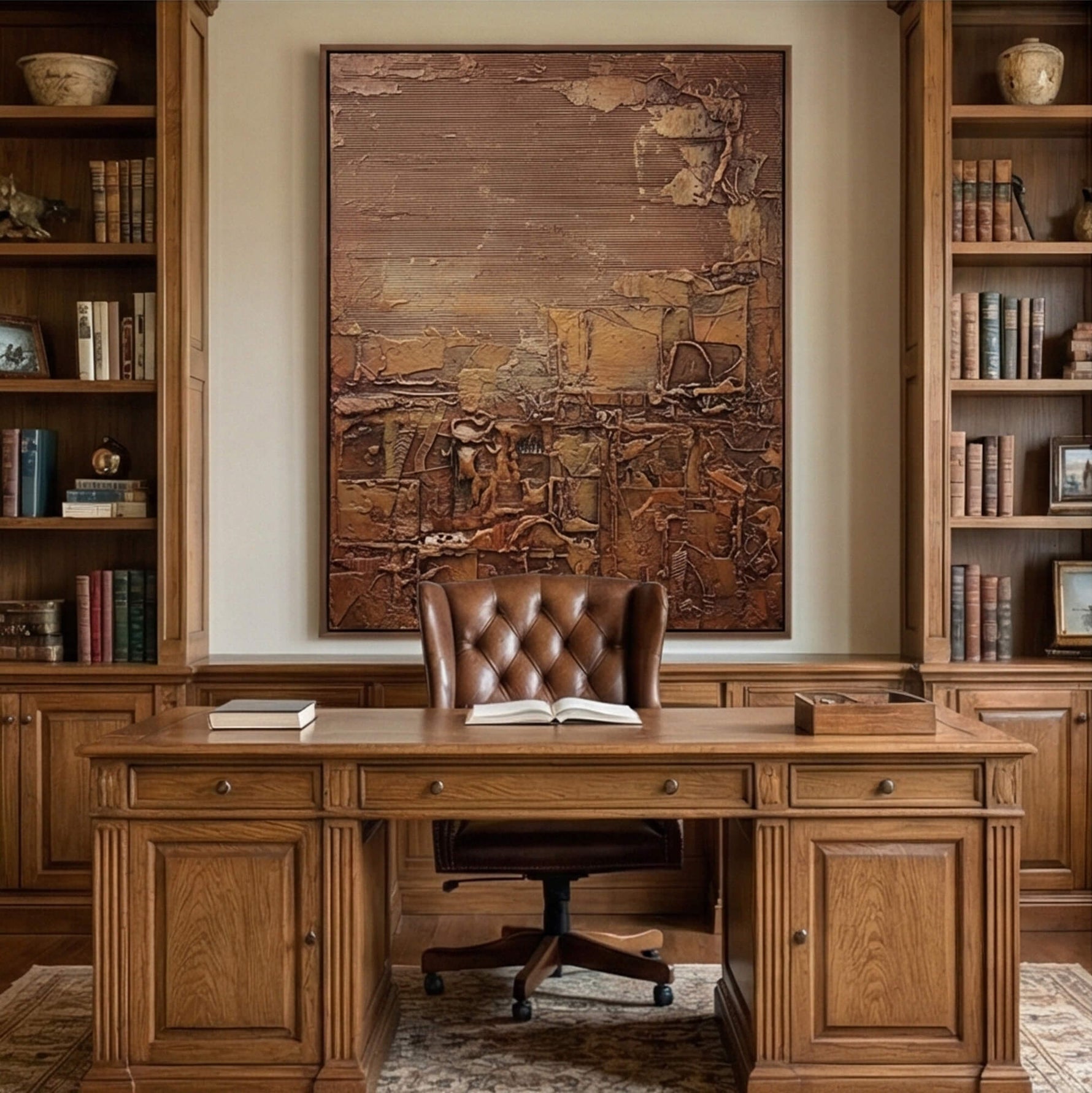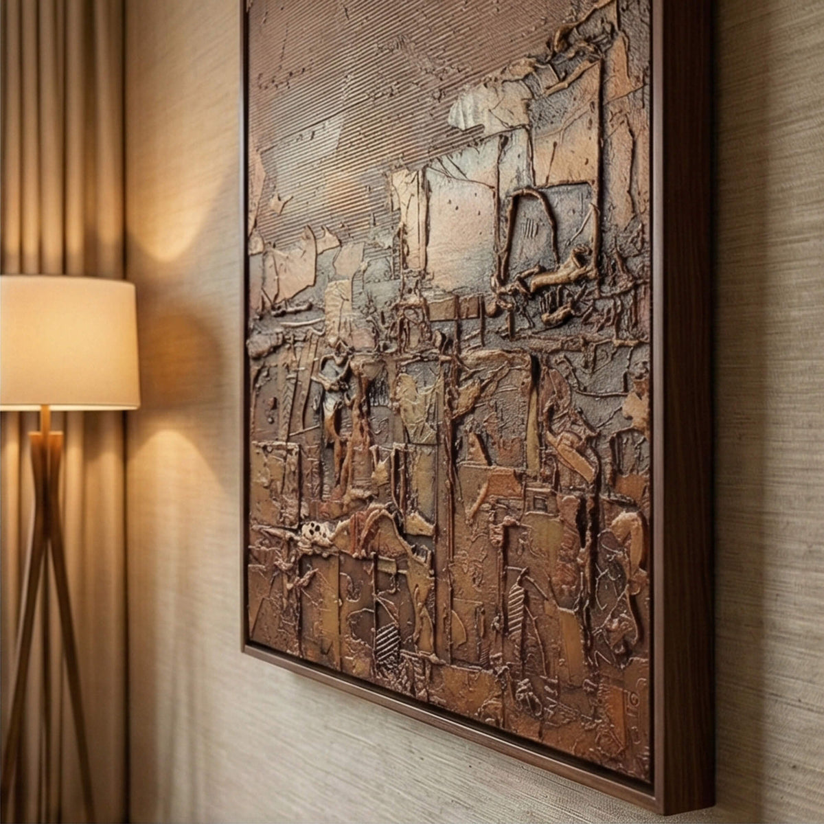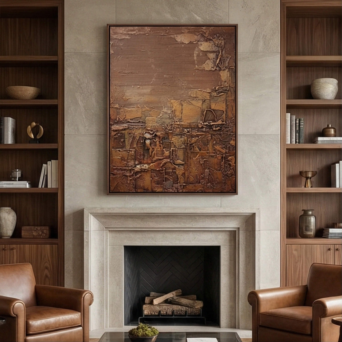 This textural abstract collage layers torn paper and thick paint in earthy umber and ochre, creating a rugged, tactile surface. Its raw, weathered appearance evokes ancient landscapes or archaeological layers, merging materiality with timeless narrative.