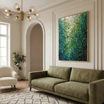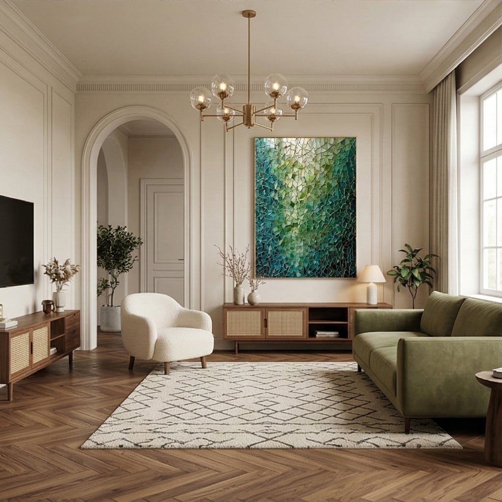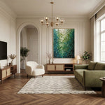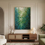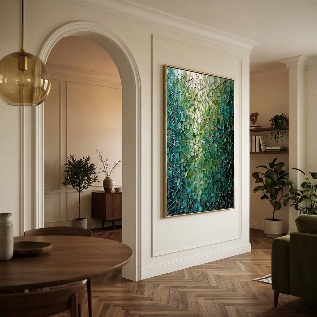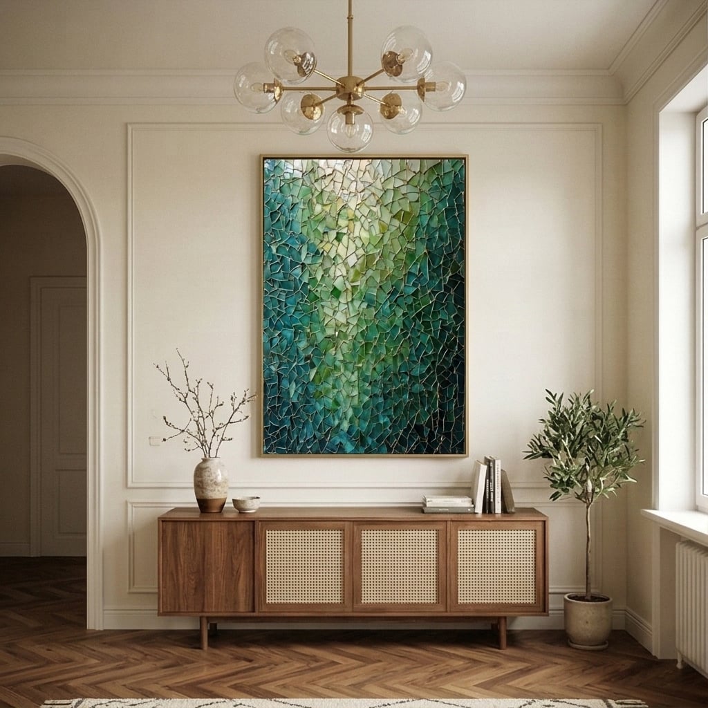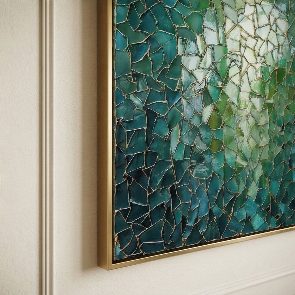 Glowing teal and emerald fragments form a mosaic-like abstract, laced with gold “kintsugi” lines. Luminous depth and fractured geometry create a dramatic, modern statement with jewel-toned elegance.