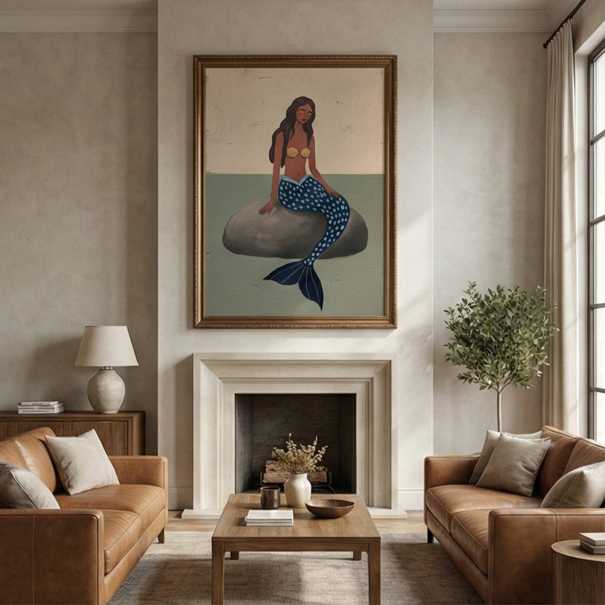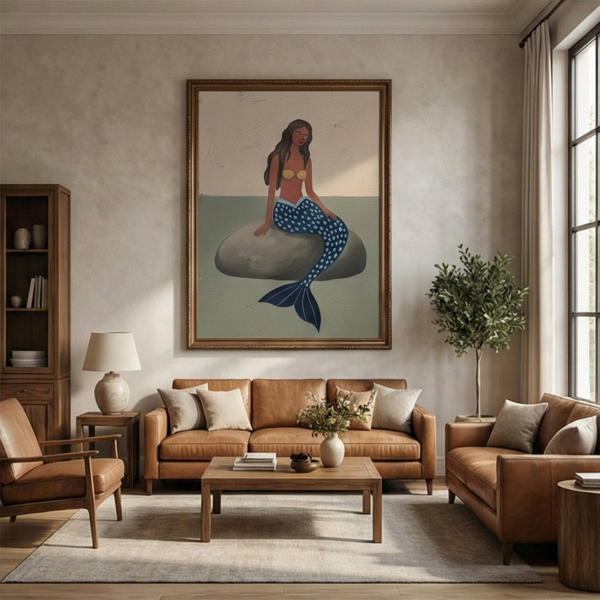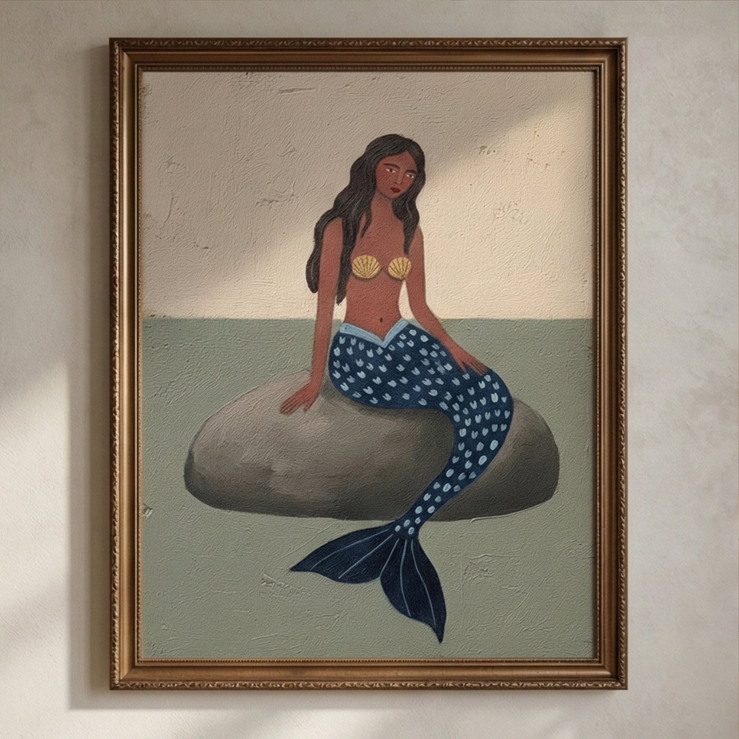 A mermaid with sun-kissed skin and a deep blue scaled tail sits pensively on a grey rock. Her gold seashell adornment and the calm, muted seascape evoke a mood of quiet solitude and timeless myth.