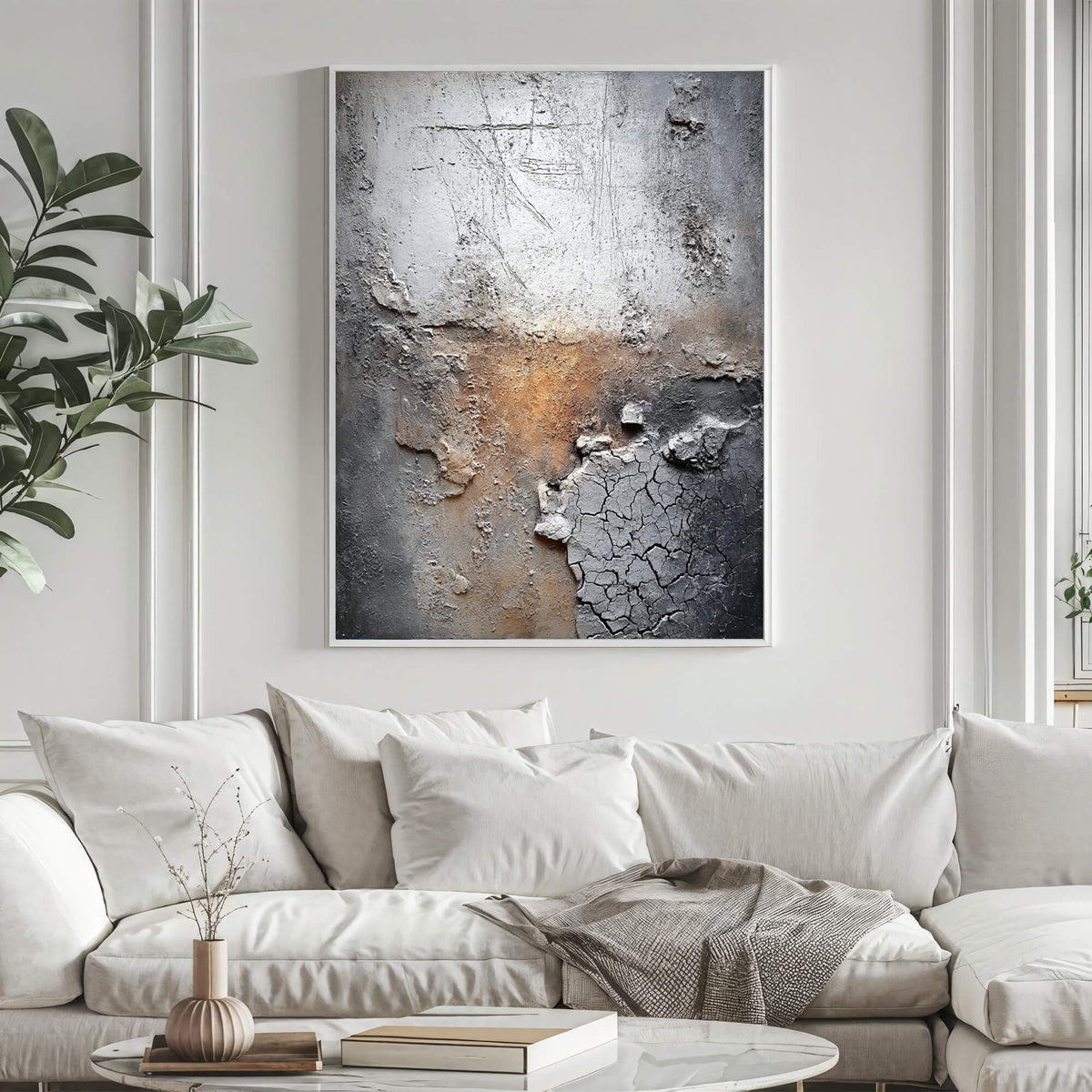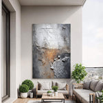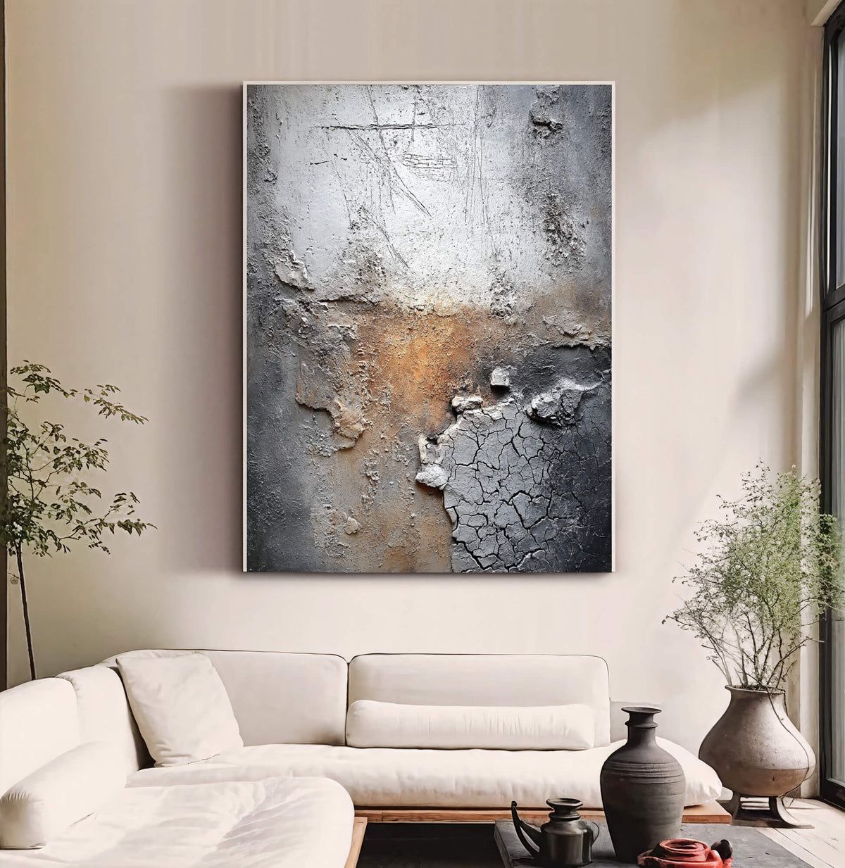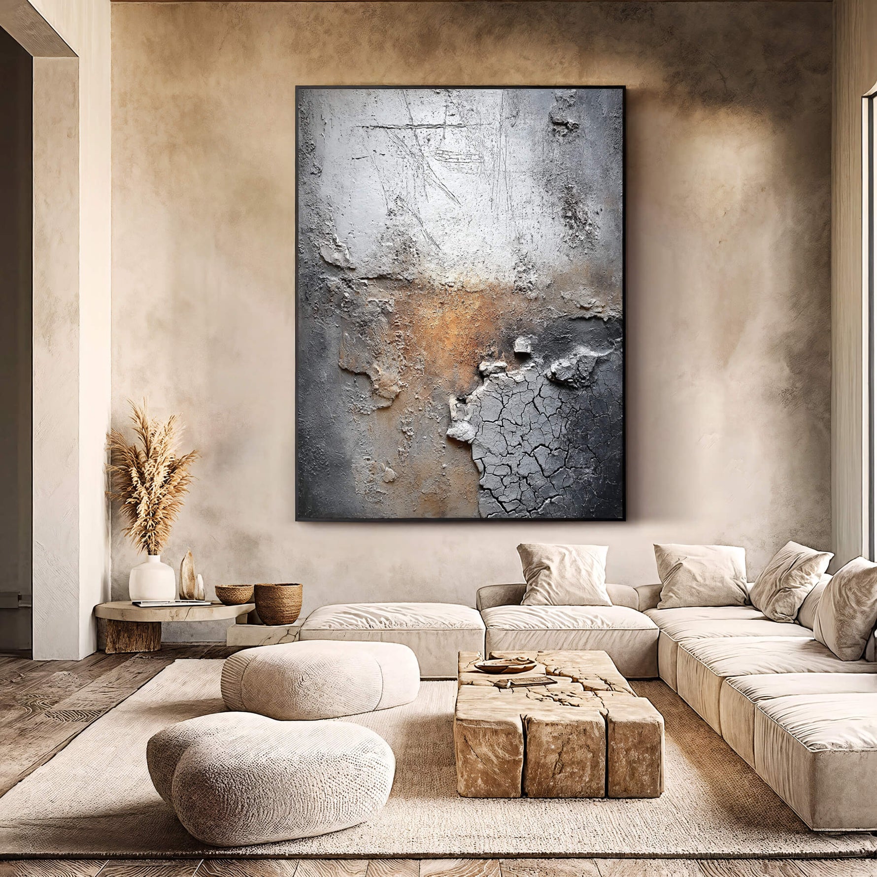 This wabi-sabi piece features eroded textures and cracked plaster with warm rust hues, embodying organic imperfection. It lends raw, weathered depth to modern spaces with quiet, rustic sophistication.