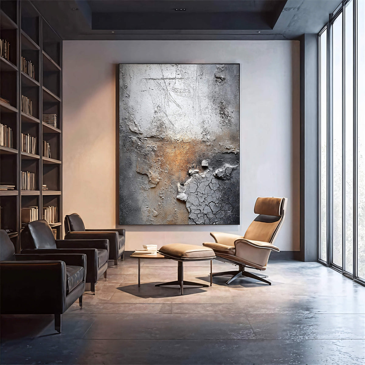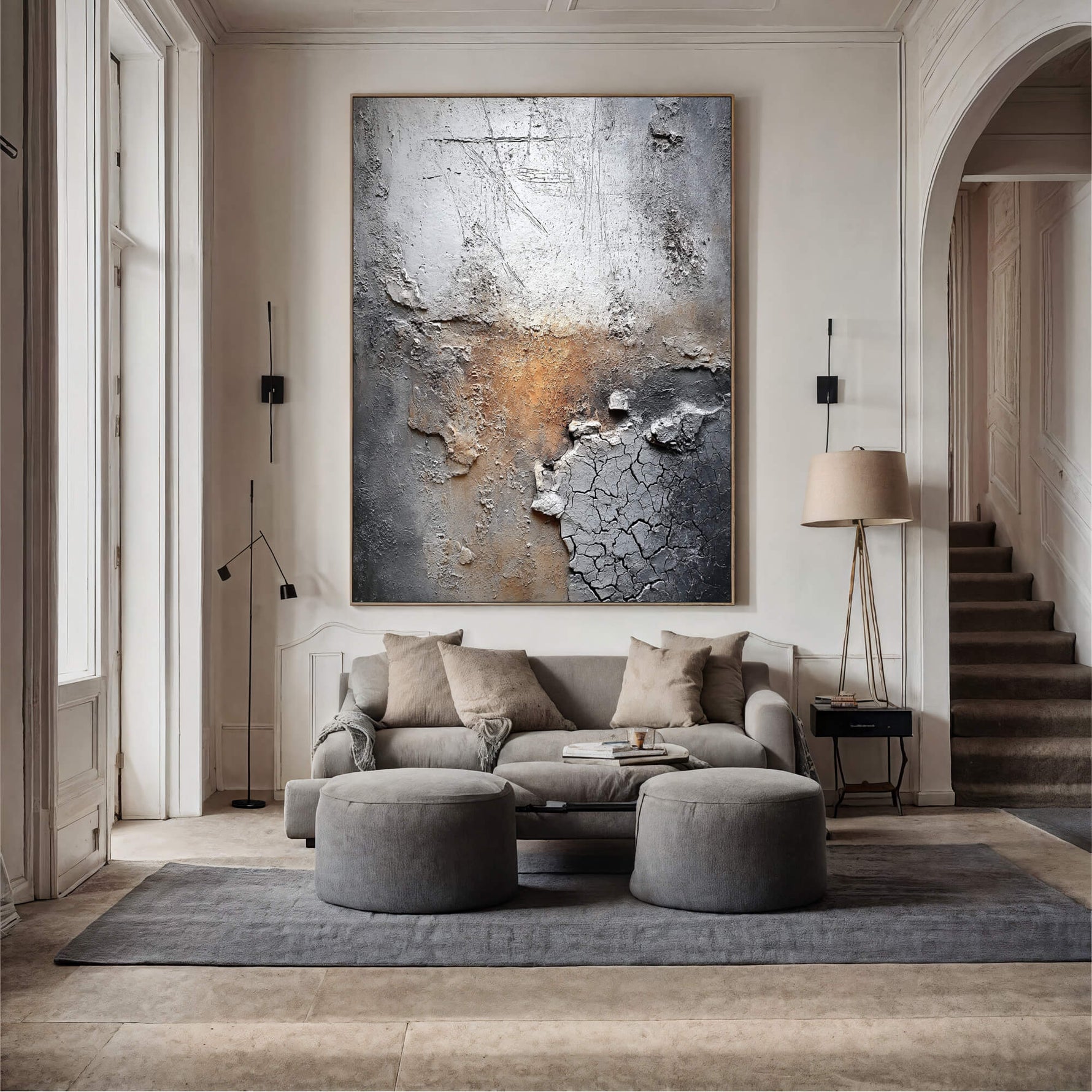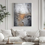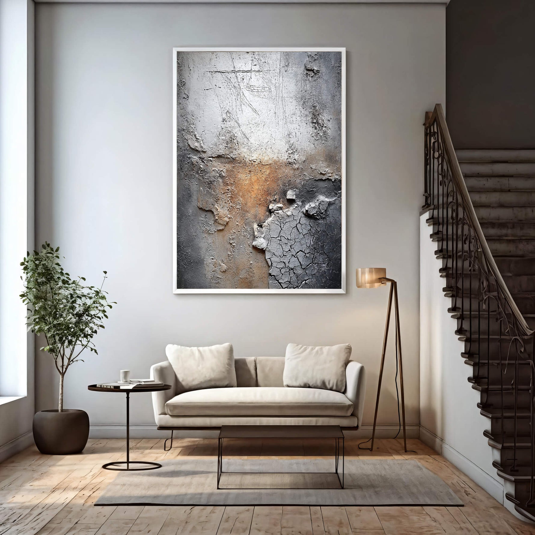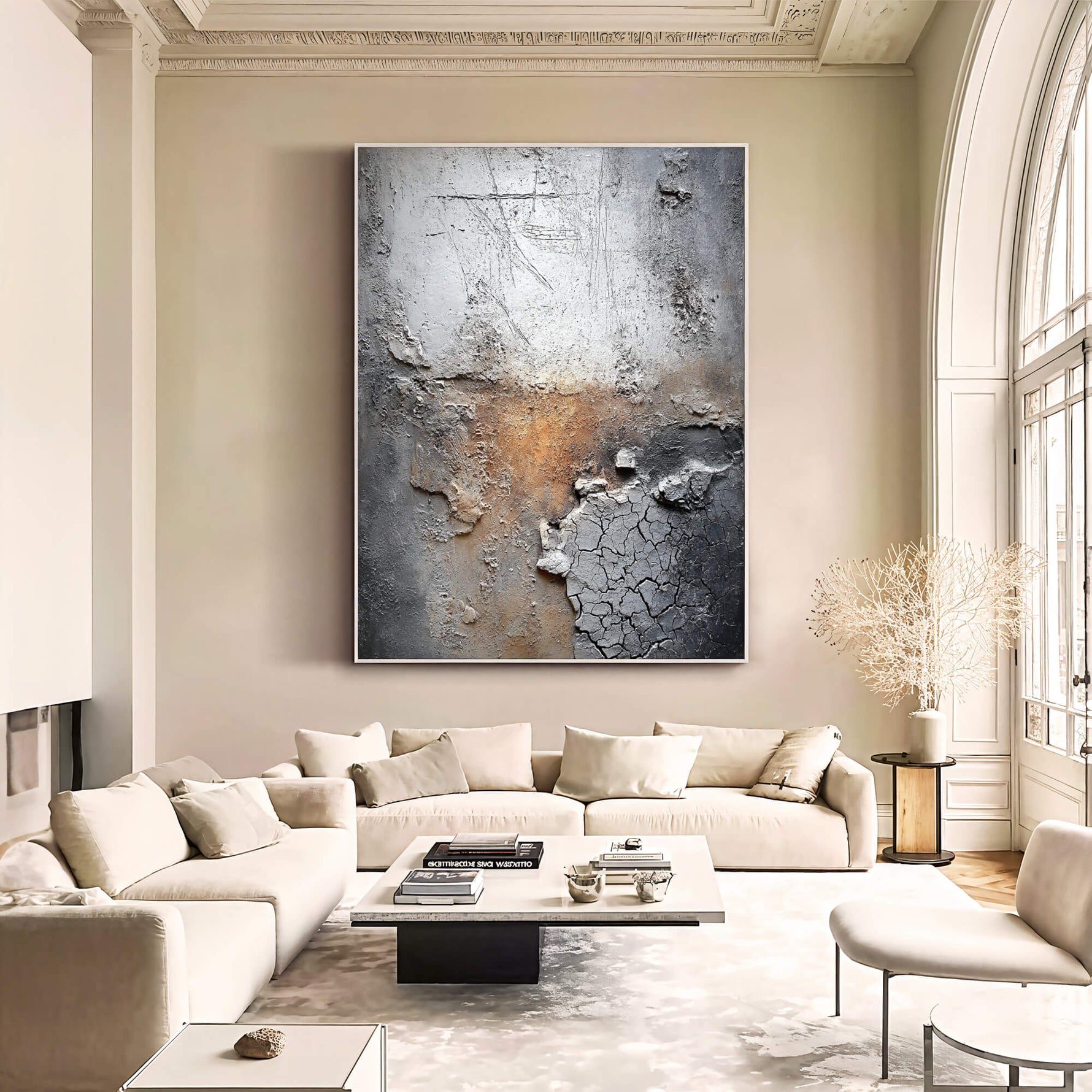 This wabi-sabi piece features eroded textures and cracked plaster with warm rust hues, embodying organic imperfection. It lends raw, weathered depth to modern spaces with quiet, rustic sophistication.